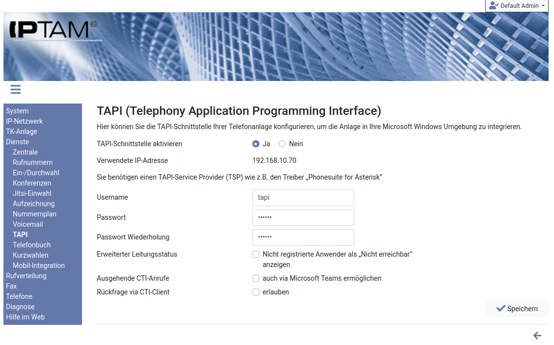 Image In der IPTAM® PBX richten Sie die TAPI-Unterstützung im Menü Dienste►TAPI ein (siehe Abbildung links).