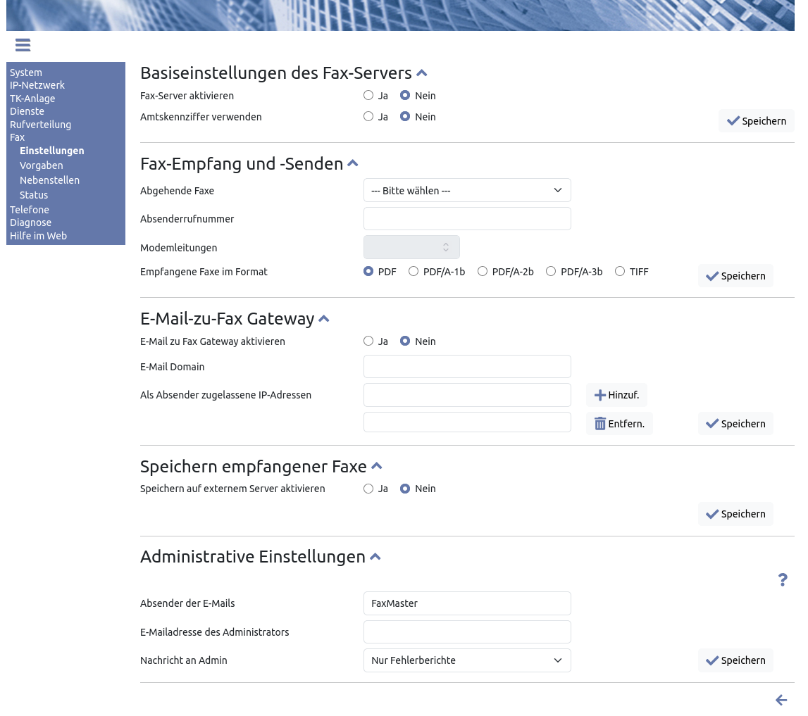 Nun können Sie ihren Fax-Server starten, indem Sie im Abschnitt „Basiseinstellungen des Fax-Servers“ den Radio-Button „Ja“ bei Fax-Server aktivieren anklicken und auf den zugehörigen Button „Speichern“ klicken. Sind Ihre Anwender es gewohnt, beim Fax anders als beim Telefonieren keine Amtskennziffer zu verwenden, können Sie durch die Auswahl „Nein“ bei „Amtskennziffer verwenden“ das sonst erforderliche Mitwählen der Amtskennziffer abschalten.
