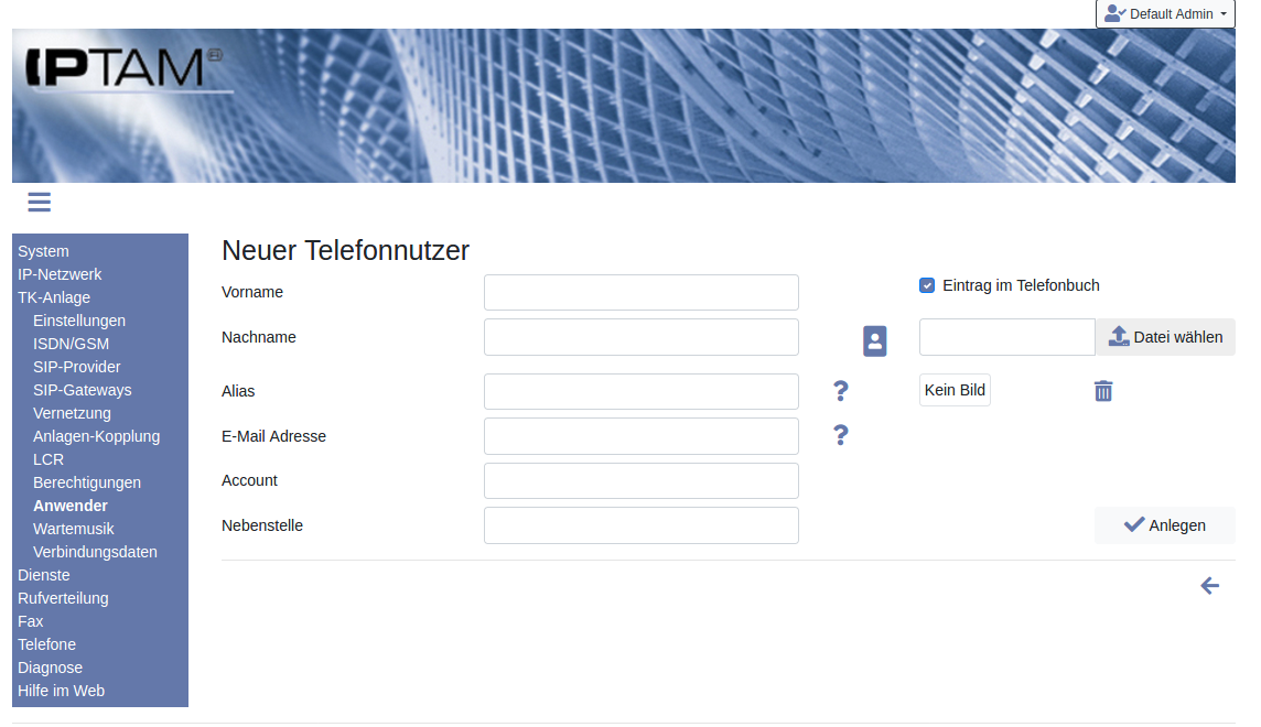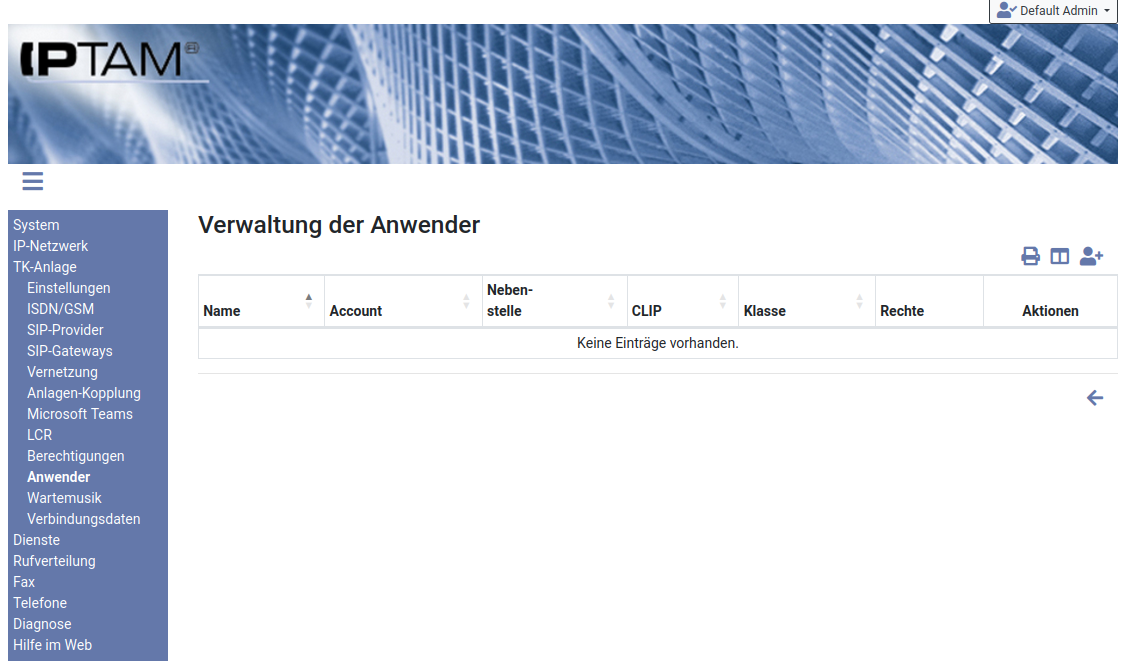 Image Nachdem Sie die vorbereitenden Einstellungen vorgenommen haben, können Sie die Anwender anlegen. Im Menüpunkt TK-Anlage►Anwender wird Ihnen die Liste der derzeit angelegten Anwender angezeigt (siehe Abbildung).
