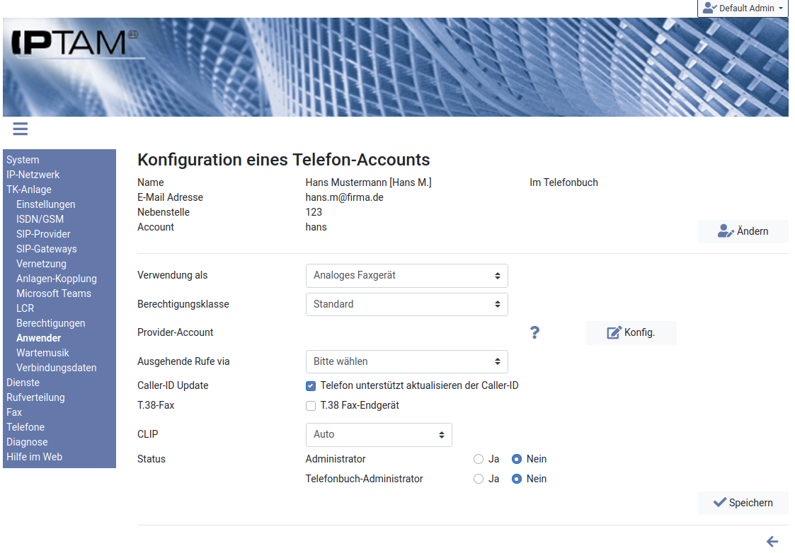 Das Auswahlfeld „Durchwahl (MSN)“ ist nur vorhanden, wenn in Ihrer IPTAM PBX mindestens einen ISDN Mehrgeräteanschluss eingerichtet haben. Sie können dann in diesem Auswahlfeld festlegen, ob diesem Fax-Gerät eine der vorhandenen MSNs zugewiesen werden soll.