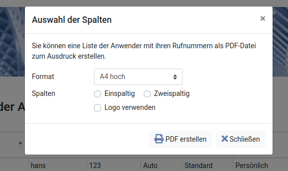Image Sie können sich eine Liste der Anwender mit ihren Nebenstellen als internes Telefonbuch zum Ausdrucken generieren. Dazu klicken Sie auf das Icon . Es öffnet sich der links dargestellte Dialog. Sie haben die Format-Optionen A4 hoch, ein- oder zweispaltig sowie A4 quer, drei- oder vierspaltig. Falls Sie ein Logo einbinden möchten, erscheint dieses oben links im Telefonbuch.