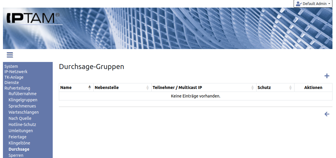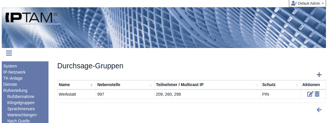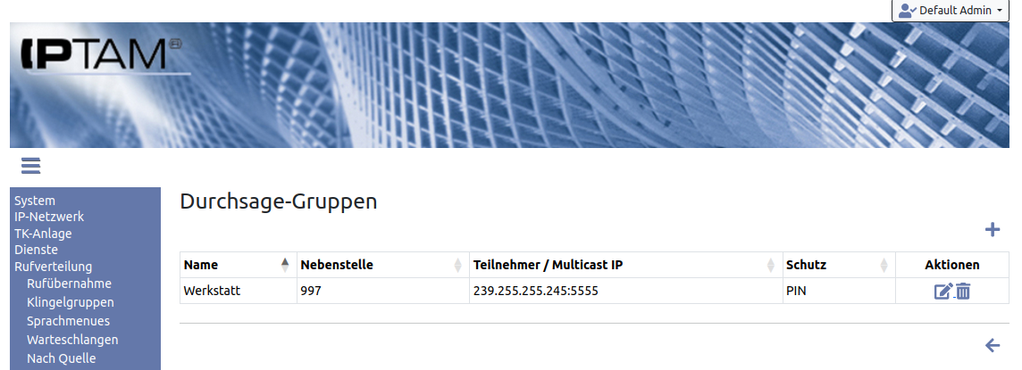 Mit Hilfe von Durchsage-Gruppen können Sie Anwendern erlauben eine Durchsage bei allen oder einem Teil der Nebenstellen durchzuführen. Der ausführende Anwender (oder der externe Anrufer) ruft die Nebenstelle der Gruppe an und autorisiert sich ggf. mit einer PIN, Anschließend beginnt er mit der Durchsage. Die in der Gruppe konfigurierten Telefone schalten beim Start der Durchsage den Lautsprecher ein und übertragen die Durchsage. Das Mikrofon der Telefone ist nicht aktiv. Der Durchsage kann ein Audio-Prompt (z.B. ein Gong) vorgeschaltet werden.Wird der Audio-Prompt als Datei bereitgestellt, besteht auch die Option, die Durchsage auf das Abspielen des Prompts zu beschränken.