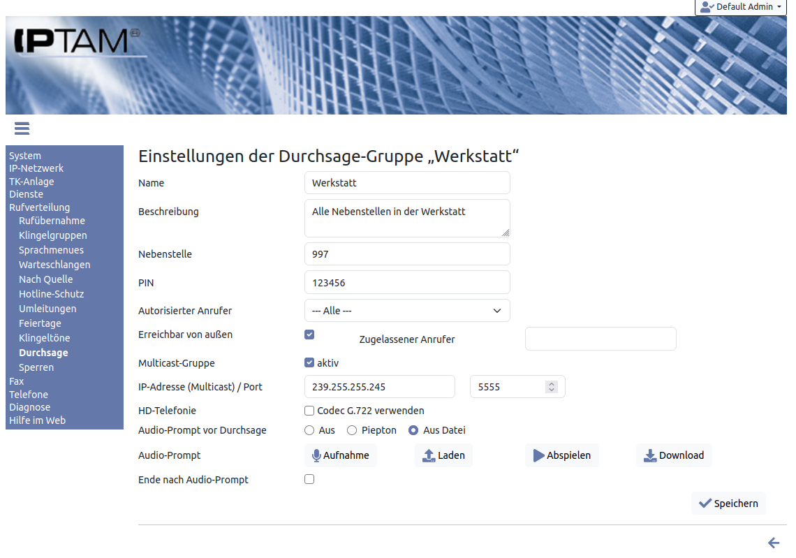 Sie vergeben einen Namen zu Dokumentationszwecken sowie eine kurze Beschreibung. Legen Sie eine Nebenstelle fest, die für eine Durchsage an diese Gruppe angerufen werden soll. Um Missbrauch zu verhindern, können Sie die Nutzung reglementieren: Sie können festlegen, dass nur ein bestimmter Anrufer eine Durchsage starten kann und Sie können eine PIN vergeben, die vor Auslösen der Durchsage-Funktion eingegeben werden muss.