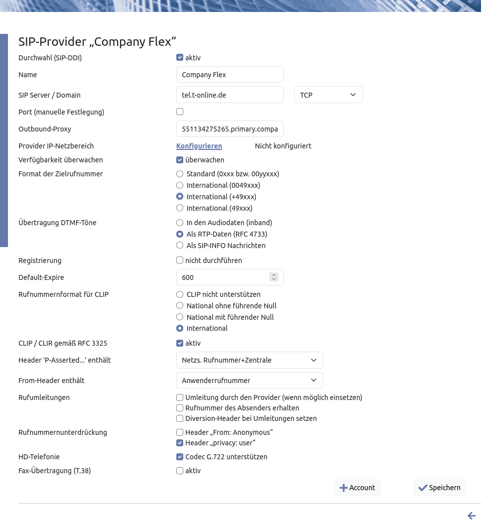 Image Klicken Sie unten rechts auf der Seite TK-Anlage►SIP-Provider auf das Icon oberhalb der Tabelle und tragen Sie die Daten wie in der nebenstehenden Darstellung gezeigt ein. Achten Sie auf die richtige Einstellung des „Outbound-Proxy“. Es ist eine längere Ziffernfolge gefolgt von „.primary.companyflex.de“. Als Protokoll kann neben „TCP“ auch „TLS“ (für verschlüsselte Telefonie) eingesetzt werden. Die Verwendung von „TLS“ ist insbesondere notwendig, wenn das Produkt über eine Fremdanschaltung (Zugang nicht über das Netz der Deutschen Telekom) genutzt wird.