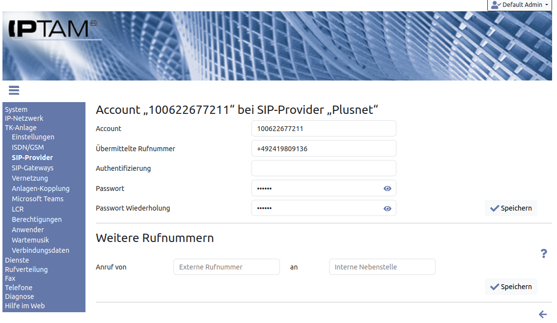 Bei diesem Provider kann die Einstellung im Bereich „NAT“ entfallen. Die Server beim Provider erkennen die öffentliche IP-Adresse ohne eine besondere Behandlung durch die IPTAM@ PBX. Falls es dennoch zu Problemen kommen sollte, folgen Sie den Einstellungen zur Konfiguration der IP Netzwerk Verbindung.