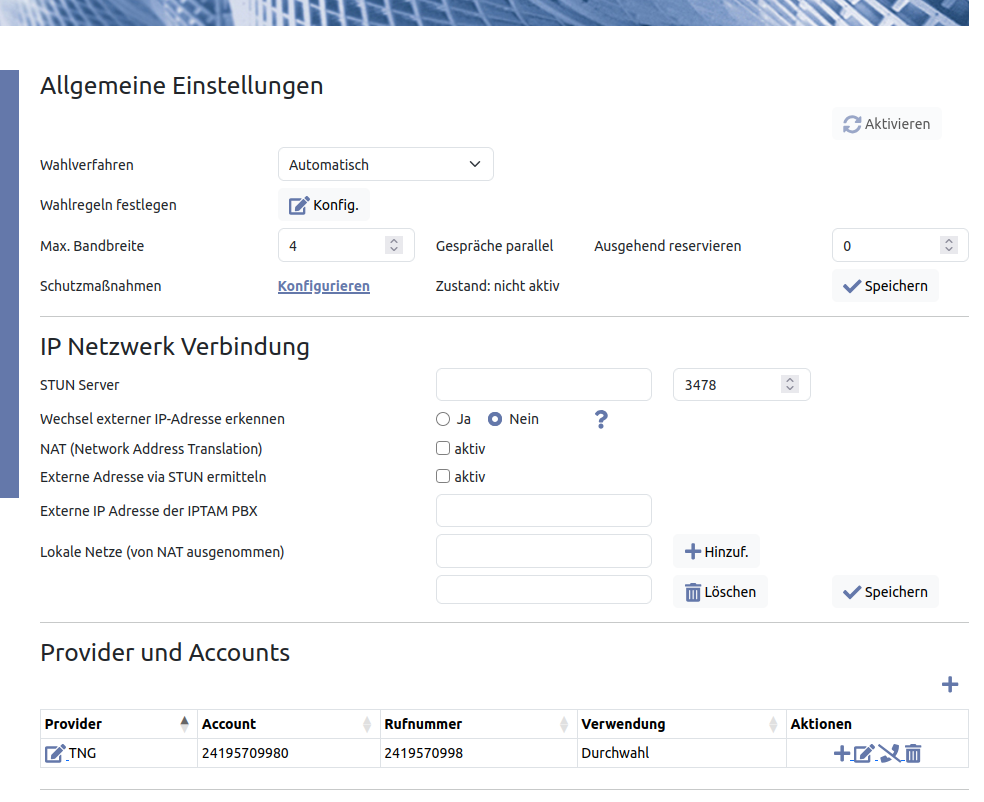 Bei diesem Provider kann die Einstellung im Bereich „NAT“ entfallen. Die Server beim Provider erkennen die öffentliche IP-Adresse ohne eine besondere Behandlung durch die IPTAM@ PBX. Falls es dennoch zu Problemen kommen sollte, folgen Sie den Einstellungen zur Konfiguration der IP Netzwerk Verbindung.