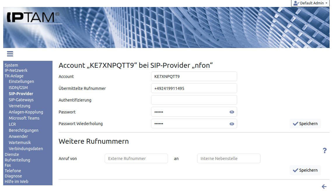 Image Mit dem Account registriert sich Ihre IPTAM® PBX beim Provider. Tragen Sie die Daten wie beispielhaft in der Abbildung gezeigt ein.