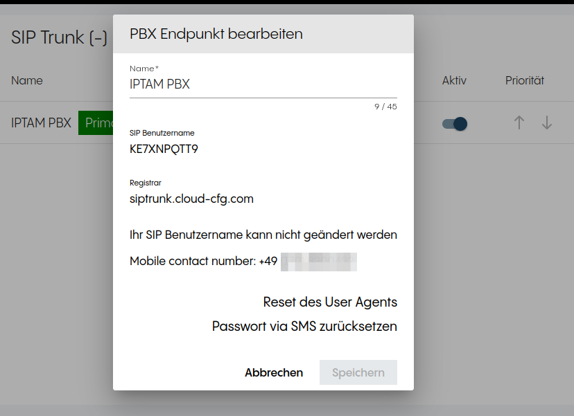 Image Image Zum Schluss legen Sie einen „PBX Endpunkt“ an. Dort sehen Sie dann die Zugangsdaten, die Sie später in der Konfiguration der IPTAM PBX benötigen. Das Passwort erhalten Sie per SMS.