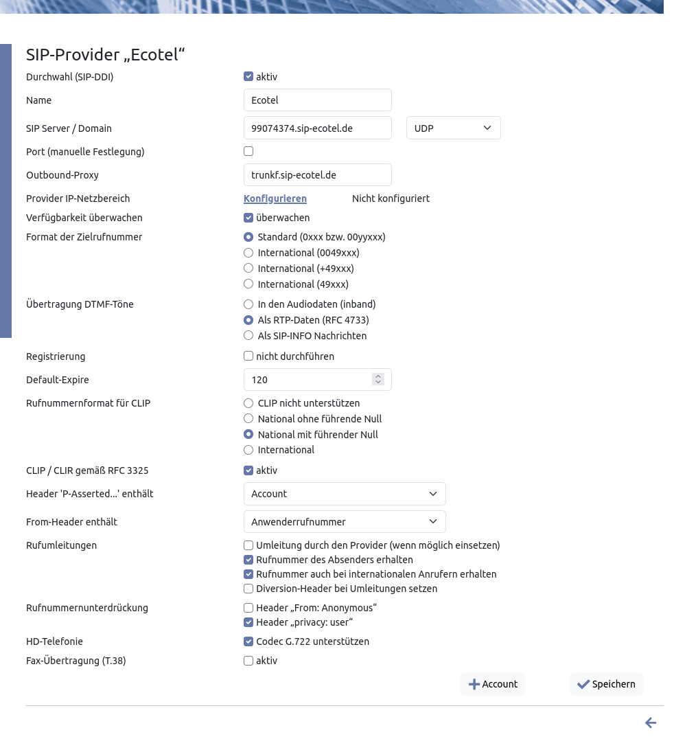 Einstellungen: ecotel sipTrunk (Ecotel Communication AG)