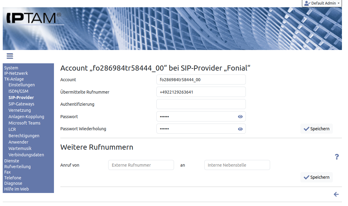 Bei diesem Provider kann die Einstellung im Bereich „NAT“ entfallen. Die Server beim Provider erkennen die öffentliche IP-Adresse ohne eine besondere Behandlung durch die IPTAM@ PBX. Falls es dennoch zu Problemen kommen sollte, folgen Sie den Einstellungen zur Konfiguration der IP Netzwerk Verbindung.