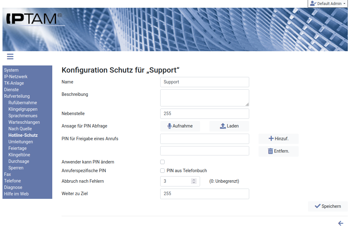 Sie können zu jeder internen Nebenstelle in Ihrer IPTAM® PBX eine Schutzfunktion einrichten, die vom Anrufer die Eingabe einer PIN erfordert. Anrufer hören dann eine passende Ansage. Nach einer einstellbaren Zahl von Fehlversuchen wird die Verbindung getrennt.