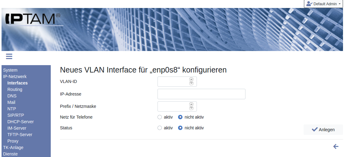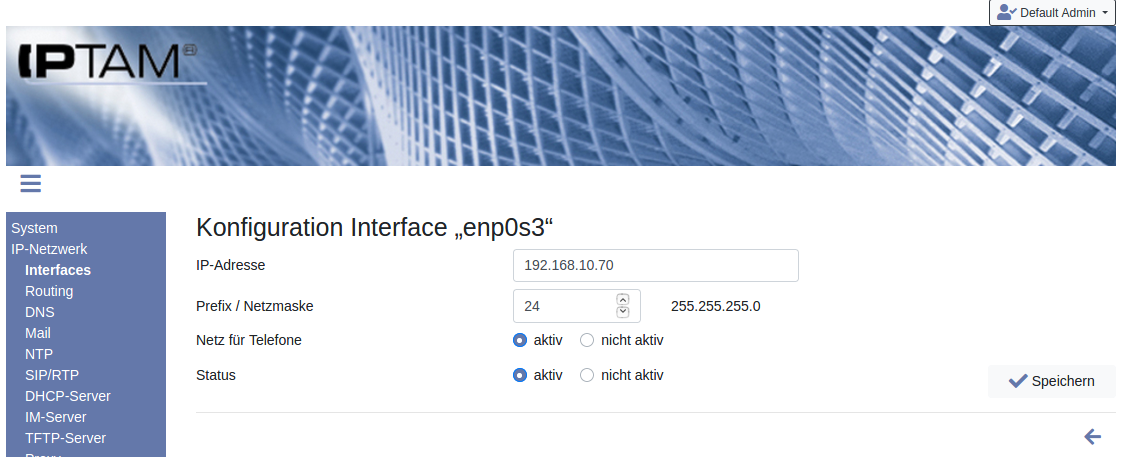 Bei der Installation der IPTAM® PBX haben Sie die IP-Adresse und Netzmaske der Anlage festgelegt. Im Menüpunkt IP-Netzwerk►Interfaces haben Sie die Möglichkeit, diese nachträglich zu ändern sowie weitere Interfaces zu konfigurieren