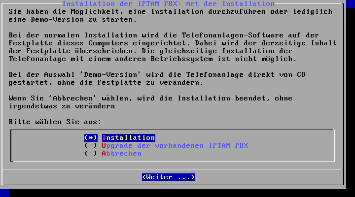 Wählen Sie „Installation“ aus, um die Installation der IPTAM® PBX auf der Festplatte zu starten.Sie aktivieren die Auswahl durch Drücken der Leertaste. Durch Drücken der Enter Taste wird die Auswahl akzeptiert und die Installation wird fortgesetzt.