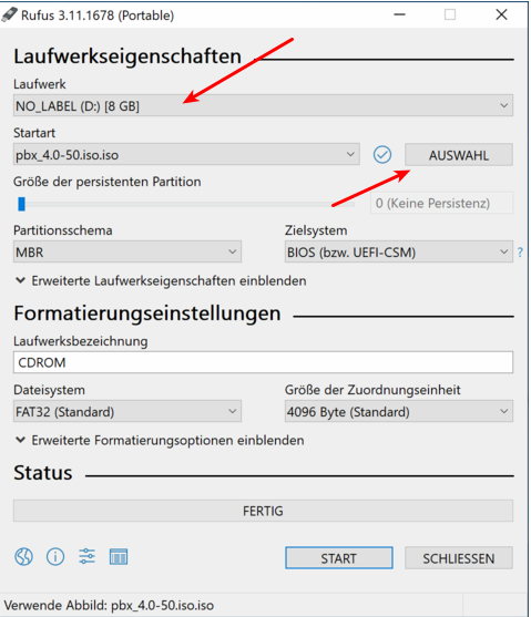 Image Nach dem Start sehen Sie das Programmfenster wie links dargestellt. Achten Sie bei „Laufwerk“ auf die richtige Auswahl. Hier muss der USB-Stick gewählt werden. Über den Button „Auswahl“ wählen Sie die ISO-Datei aus. Nach dem Start erscheint ggf. eine Warnung über fehlende Bestandteile, die nachgeladen werden sollen. Das können Sie bestätigen, es hat keine Auswirkungen.