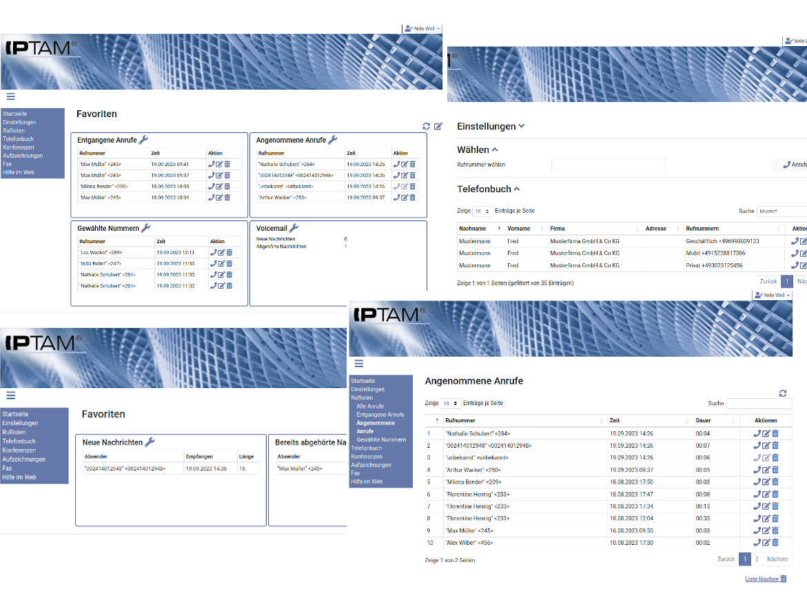Anwender der IPTAM PBX nutzen die Web-Oberfläche, um sich über angenommene und entgangenen Anrufe zu informieren, aufgezeichnete Gespräche und Nachrichten anzuhören und ihre Rufumleitung einzustellen. Dies tun sie entweder über den Browser ihres PCs, Tablet PCs oder Smartphones oder Sie nutzen die Funktionen moderner IP Telefone, die mit ihren XML Browsern ebenso erlauben, auf die Funktionen der IPTAM PBX zuzugreifen.