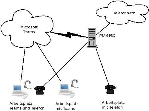 Bei Einsatz der entsprechenden Microsoft Lizenzen kann aus Teams heraus über die IPTAM PBX in das öffentliche Netz telefoniert werden und Gespräche aus dem öffentlichen Netz gelangen an die Teams-Clients.