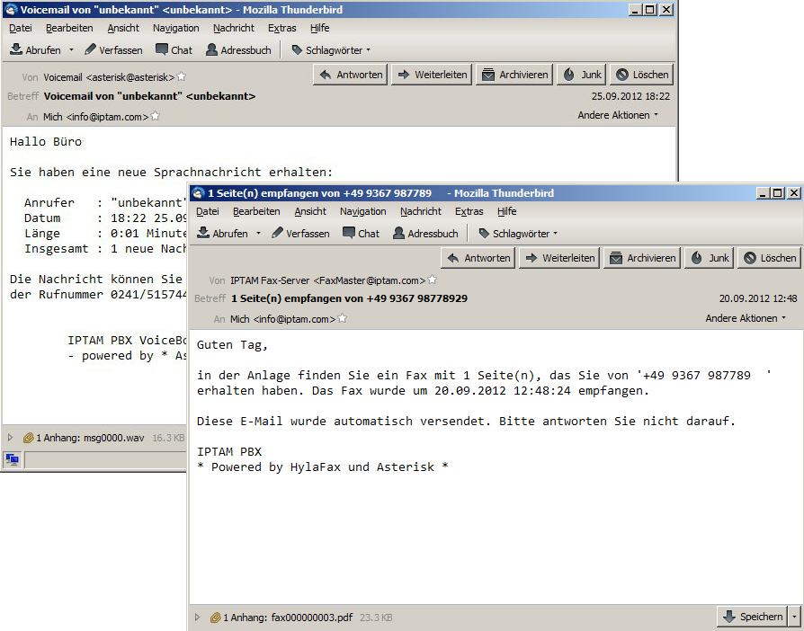 Die IPTAM PBX informiert sie über eingehende Faxe und eingegangene Sprachnachrichten per e-Mail und stellt ihnen diese als Dateianhang zu. So können Sie bequem ihre Sprachnachrichten überall dort abhören, wo sie Ihre e-Mails empfangen.