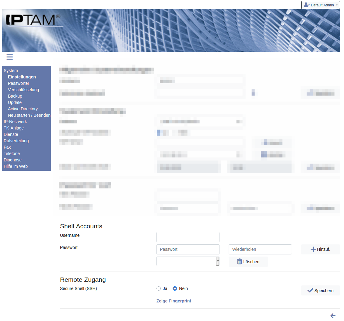 System►Einstellungen haben Sie die Möglichkeit den Remote Zugang für das Protokoll Secure Shell (SSH) freizugeben oder zu sperren. Sie finden die Optionen unten auf der Seite. Nach der Installation ist der Zugang aus Sicherheitsgründen zunächst nicht freigegeben.