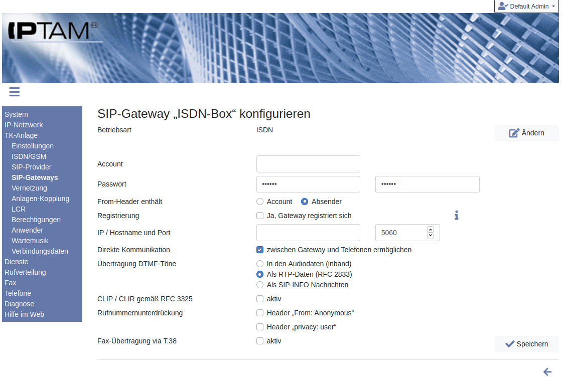 Unterstützt Ihr ISDN Gateway die Übertragung von Fax-Nachrichten im LAN über das T.38 Protokoll, können Sie die Unterstützung dieses Features in der IPTAM® PBX aktivieren. Hinweise finden Sie auch im Abschnitt Fax-Übertragung mittels T.38 Protokoll.