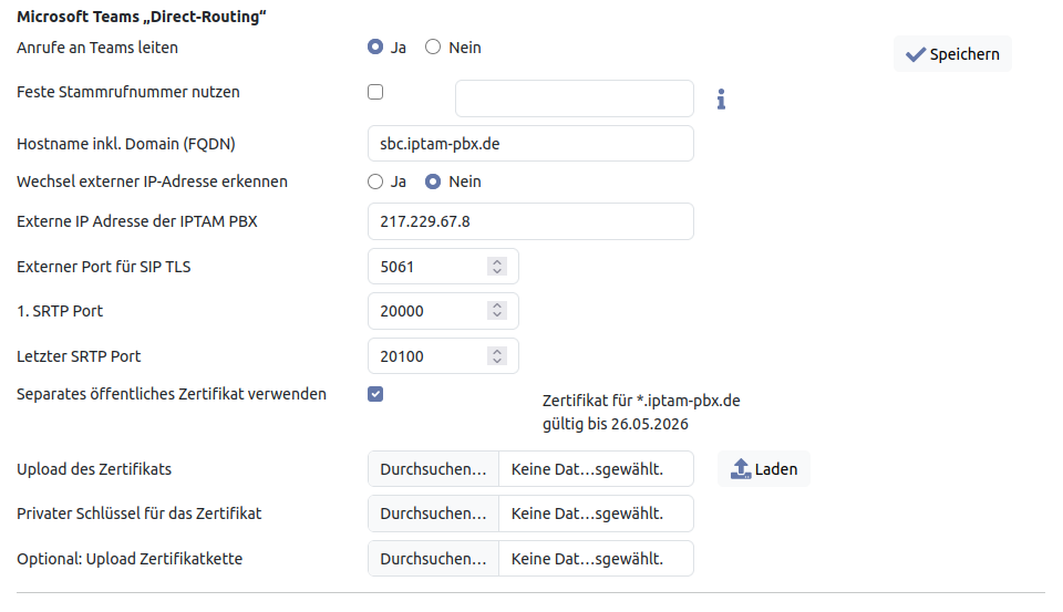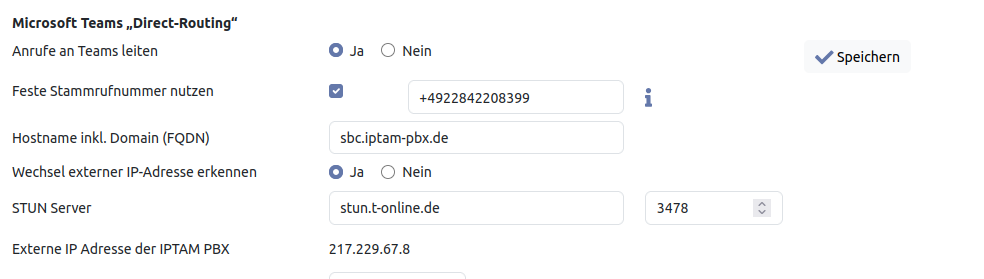 Die Teams-Plattform muss Ihre IPTAM® PBX erreichen können. Daher benötigen Sie eine Port-Weiterleitung in Ihrem Router/Ihrer Firewall. Die Signalisierung für SIP-TLS läuft im Normalfall auf Port 5061. Sie können einen abweichenden Port auf der öffentlichen Seite verwenden, wenn Sie das auch in der Teams-Plattform berücksichtigen (siehe Einstellungen zum SBC der Teams-Plattform auf der vorherigen Seite). Den gewählten externen Port leiten auf den internen Port 5063 in der IPTAM® PBX weiter. Daneben benötigen Sie noch Portweiterleitungen für die Medienports (analog zu denen bei den Remote-Clients).
