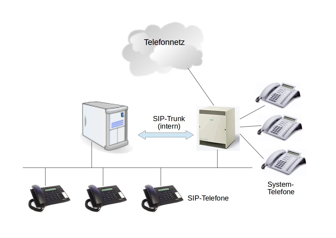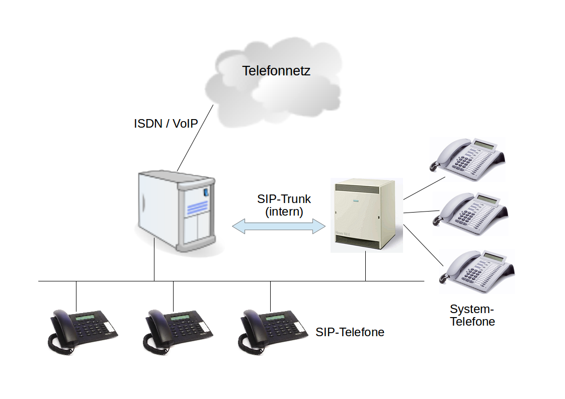 In diesem Abschnitt geht es um die Kopplung zu TK-Anlagen (anderer Hersteller) typischerweise am gleichen Ort. Die Anwender verteilen sich auf beide Anlagen (z.B. zu Zwecken der Migration). Eine oder beide Anlagen verfügen über einen Anschluss an das öffentliche Netz. Die Kommunikation zwischen den Anlagen erfolgt über SIP.