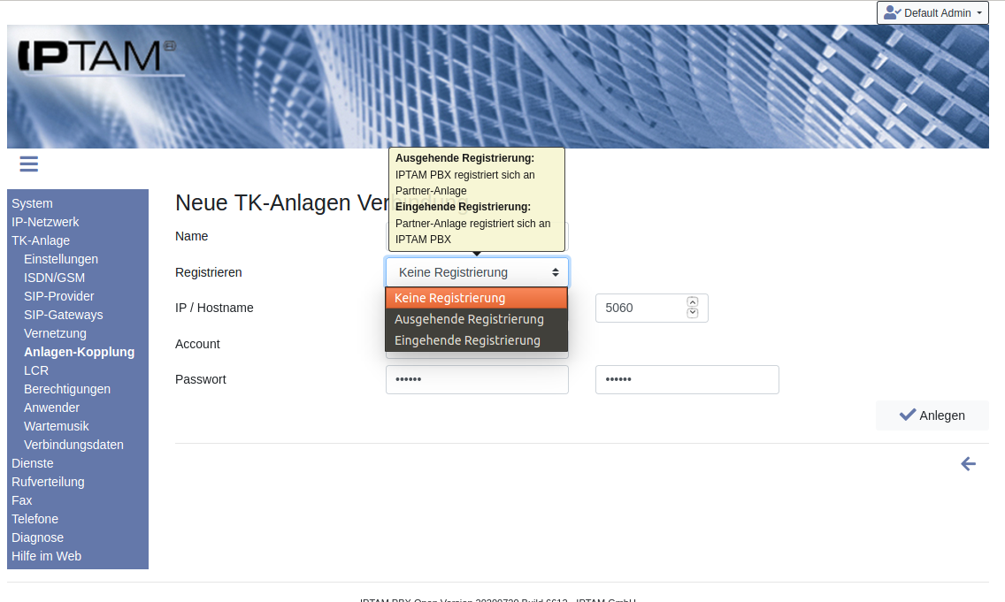 • Eingehende Registrierung: Die andere TK-Anlage registriert sich an der IPTAM® PBX. Account und Passwort müssen konfiguriert werden.