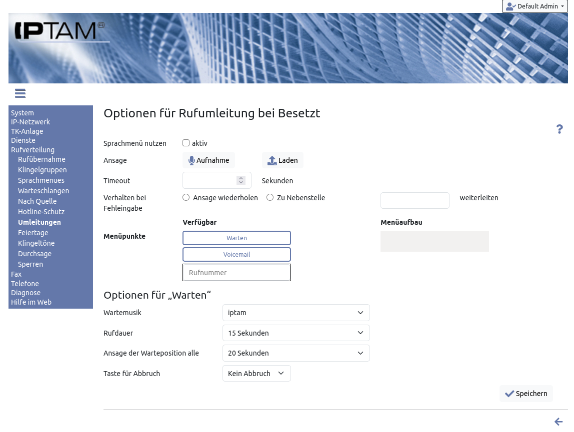 Ansage fest, in der die Auswahlmöglichkeiten für die Anrufer erläutert werden. Mit dem „Timeout“ bestimmen Sie wie lange Ihre IPTAM