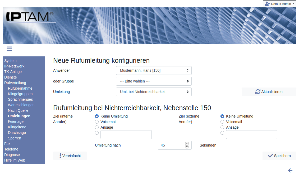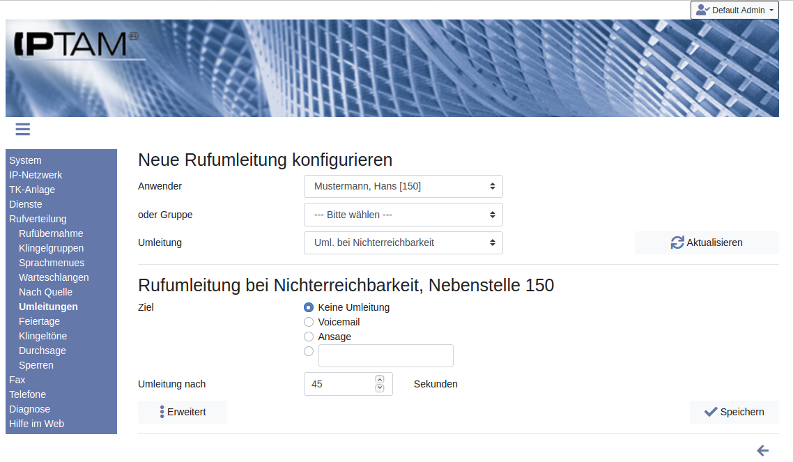 - Wenn bei einem Anwender Anrufe an ein externes Ziel umgeleitet werden (durch eine der anderen hier genannten Umleitungen) und das Gespräch am Ziel nicht angenommen wird, kann das Gespräch zur Voicemail oder zu einem neuen Ziel in der IPTAM PBX geleitet werden.