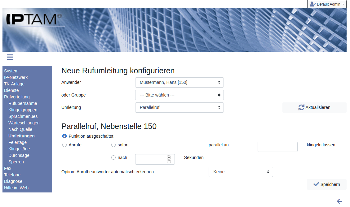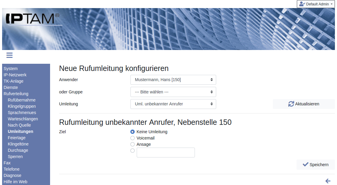 Die IPTAM® PBX verfügt über unterschiedliche Rufumleitungsszenarien. Die Umleitung leitet den Anrufer jeweils zu einer anderen Nebenstelle, einem externen Ziel, dem Anrufbeantworter des Anwenders oder zu einer Ansage. Es werden nur Anrufe umgeleitet, die direkt an einen Anwender gerichtet sind:- Permanente Umleitung