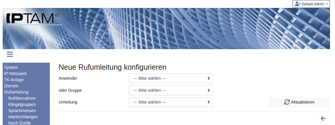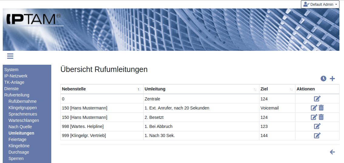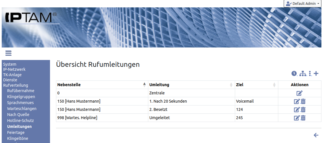 Jeder Anwender Ihrer IPTAM® PBX kann seine persönliche telefonische Erreichbarkeit durch unterschiedliche Umleitungen steuern (siehe dazu auch Abschnitt 3 „Rufumleitungen“ im Anwenderhandbuch). Darüber hinaus können Anrufe an Gruppen von Anrufern (Warteschlangen, Klingelgruppen) umgeleitet werden.Der Administrator kann im Menü Rufverteilung►Umleitungen eine Übersicht aller aktiven Umleitungen in der Telefonanlage einsehen sowie diese ändern oder neu konfigurieren. Neben den Umleitungen der Anwender werden auch die Weiterleitungen aus Warteschlangen und Klingelgruppen hier aufgelistet, so dass der Administrator an einer Stelle alle Umleitungen im Blick hat.