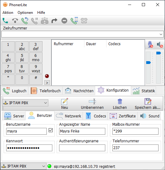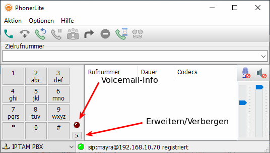 Die rechts neben dem Ziffernblock dargestellte LED zeigt an, wenn neue Nachrichten auf Ihrer Voicemailbox vorliegen. Wenn Sie mit der Maus darüber gehen, wird der Status (Neue Nachrichten, alte Nachrichten) angezeigt. Der „>“-Button darunter blendet die Details wie „Konfiguration“ und „Telefonbuch“ ein bzw. aus. Sie können die Telefonbucheinträge, falls es sich um interne Rufnummern handelt, zur Statusanzeige ähnlich den BLF-Tasten nutzen, indem Sie im Kontextmenü des Eintrags „abonnieren“ wählen. Die Einträge des Telefonbuchs können auf das Kurzwahlfeld neben dem Tastenblock verschoben werden. Weitere Hinweise zur Verwendung finden Sie in der Dokumentation des Anbieters und in dem dortigen Forum.