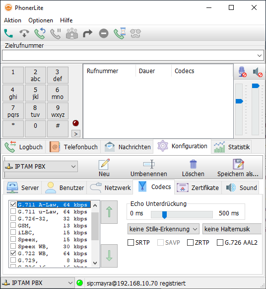 - Im Reiter „Codecs“ deaktivieren Sie in der Liste alles bis auf „G.711 A-law“, „G.722 WB“ und „DTMF (OOB)“