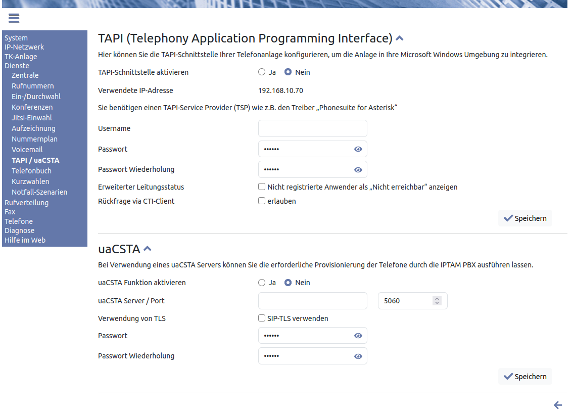 Im unteren Abschnitt sehen Sie Einstellungen zu „uaCSTA“. Die Abkürzung steht für User Agent Computer Supported Telecommunications Applications und beschreibt eine weitere Schnittstelle zur Computer Telefonie Integration. Wenn Sie z.B. ESTOS ProCall mit uaCSTA verwenden, benötigen die IP-Telefone der IPTAM® PBX eine versteckte zusätzliche Identität zur Kommunikation. Wenn Sie die Daten zur Kommunikation mit dem uaCSTA-Server hier eintragen, werden die Telefone der Hersteller Snom und Yealink passend provisioniert.