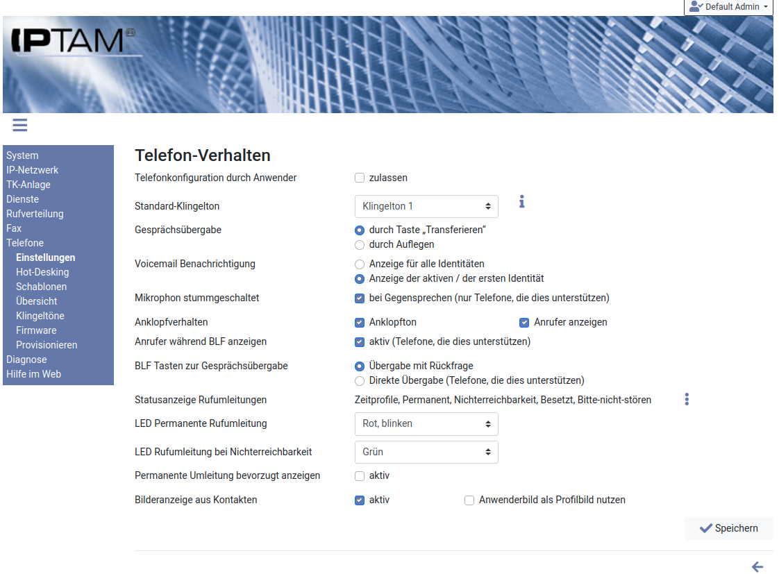 Wenn Sie die Box „Telefonkonfiguration durch Anwender“ aktivieren, können Ihre Anwender die Telefone selbst konfigurieren. Dadurch haben sie im Menü Einstellungen►Telefon konfigurieren ihres persönlichen Web-Portals der IPTAM® PBX die Möglichkeit, die Tasten zu belegen und den Klingelton festzulegen. Nach dem Speichern von Änderungen können die Änderungen an das Telefon gesendet werden. Ihre Anwender können so z.B. selbst Zielwahltasten oder Tasten für das Besetztlampenfeld konfigurieren.Standard-Klingelton