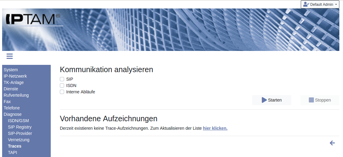 Image Ihre IPTAM PBX hilft Ihnen bei der Diagnose von reproduzierbaren Fehlern. Kommen Anrufe nicht zu Stande, brechen ab oder werden falsch umgeleitet oder nicht umgeleitet, kann die Aufzeichnung der Kommunikation und der internen Abläufe helfen.