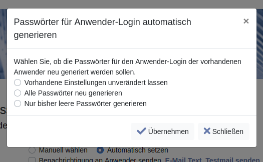 Image Image Wenn Sie auf automatisch vergebene Passwörter umschalten, erhalten Sie einen Hinweis, falls bereits Anwender konfiguriert sind (linke Abbildung). Sie können dann wählen, wie mit deren Passwörtern zu verfahren ist. Sie können Ihre Anwender mit Hilfe einer E-Mail mit konfigurierbarem Text über das Passwort informieren. Die Konfiguration des E-Mail Textes erfolgt über den Link „E-Mail Text“ (siehe Abbildung rechts). Aktivieren Sie die Checkbox „Jetzt benachrichtigen“, um allen noch nicht benachrichtigten Anwendern jetzt eine E-Mail zu senden. Beim Anlegen neuer Anwender erhalten diese sofort eine E-Mail. Sie können bei den Anwender jeweils ein neues Passwort generieren und ggf. das Versenden der E-Mail anstoßen.