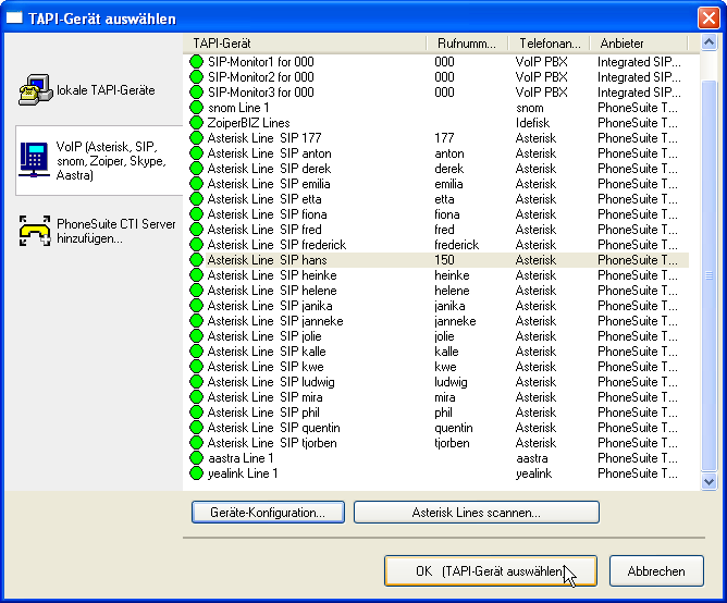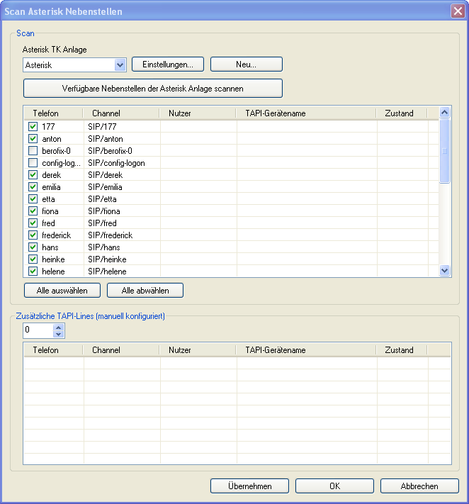 Klicken Sie auf „Verfügbare Nebenstellen der Asterisk Anlage scannen“. Sie erhalten dann eine Liste aller SIP-Kommunikationspartner in der IPTAM® PBX. Sie können gezielt die Nebenstellen auswählen, die Ihr CTI-Client nutzen oder überwachen soll.