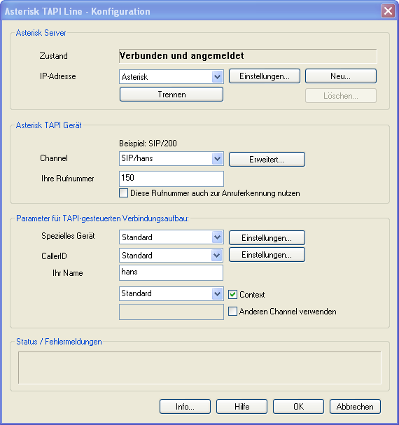 Hier können Sie durch Klicken auf einen der Buttons „Wählereinstellungen“, „Treiber Konfiguraion“ oder „Erweiterte Einstellungen“ Korrekturen an den bisherigen Eingaben vornehmen. Sie können auch später zu diesem Dialog zurück gelangen. Klicken Sie zum Abschluss auf „OK“.