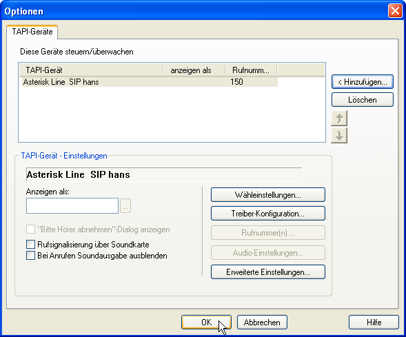Wählen Sie jetzt eines der TAPI-Geräte aus und klicken Sie auf „Geräte-Konfiguration“.