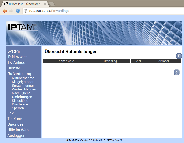Jeder Anwender Ihrer IPTAM® PBX kann seine persönliche telefonische Erreichbarkeit durch unterschiedliche Umleitungen steuern (siehe dazu auch Abschnitt 3 „Rufumleitungen“ im Anwenderhandbuch).Der Administrator kann im Menü Rufverteilung ► Umleitungen eine Übersicht aller aktiven Umleitungen in der Telefonanlage einsehen sowie diese ändern oder neu konfigurieren. Neben den Umleitungen der Anwender werden auch die Weiterleitungen aus Warteschlangen und Klingelgruppen hier aufgelistet, so dass der Administrator an einer Stelle alle Umleitungen im Blick hat..