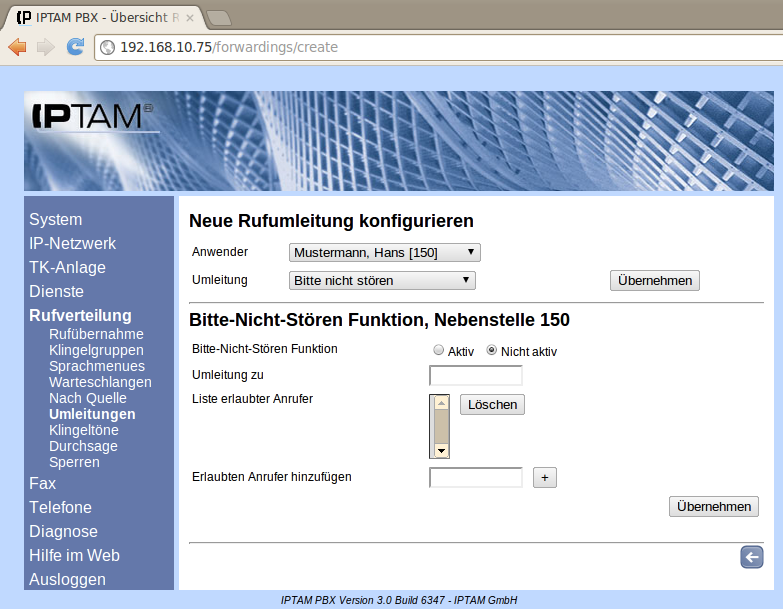 Die IPTAM® PBX verfügt über unterschiedliche Rufumleitungsszenarien. Die Umleitung leitet den Anrufer jeweils zu einer anderen Nebenstelle, einem externen Ziel, dem Anrufbeantworter des Anwenders oder zu einer Ansage. Es werden nur Anrufe umgeleitet, die direkt an einen Anwender gerichtet sind:- Permanente Umleitung