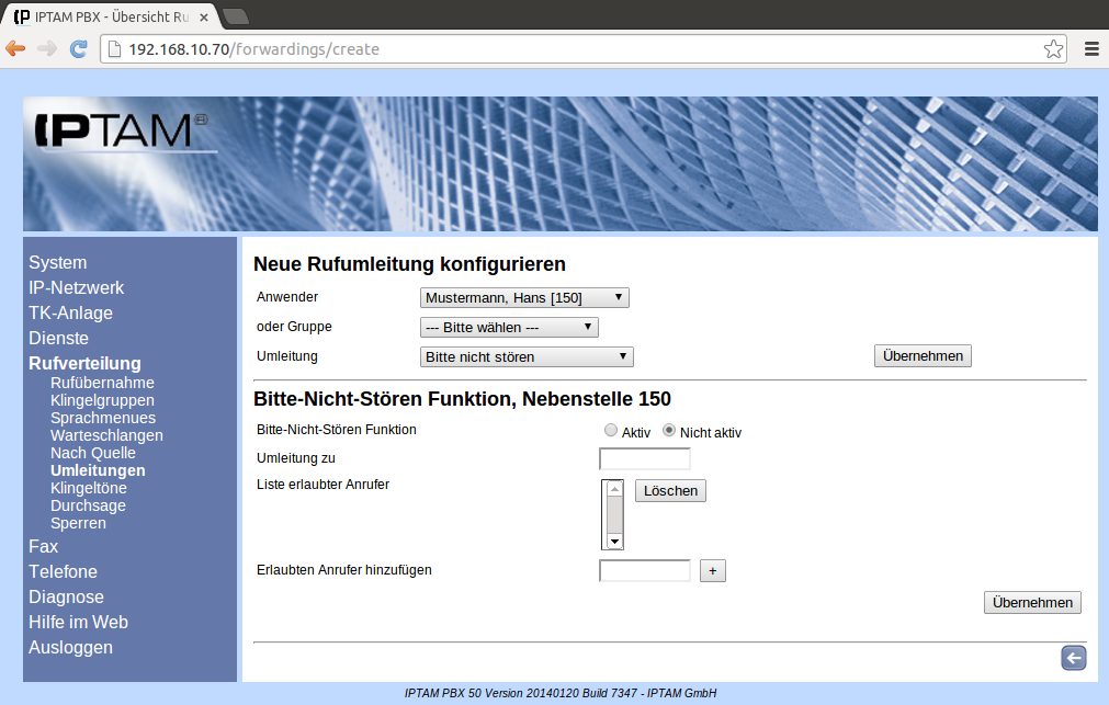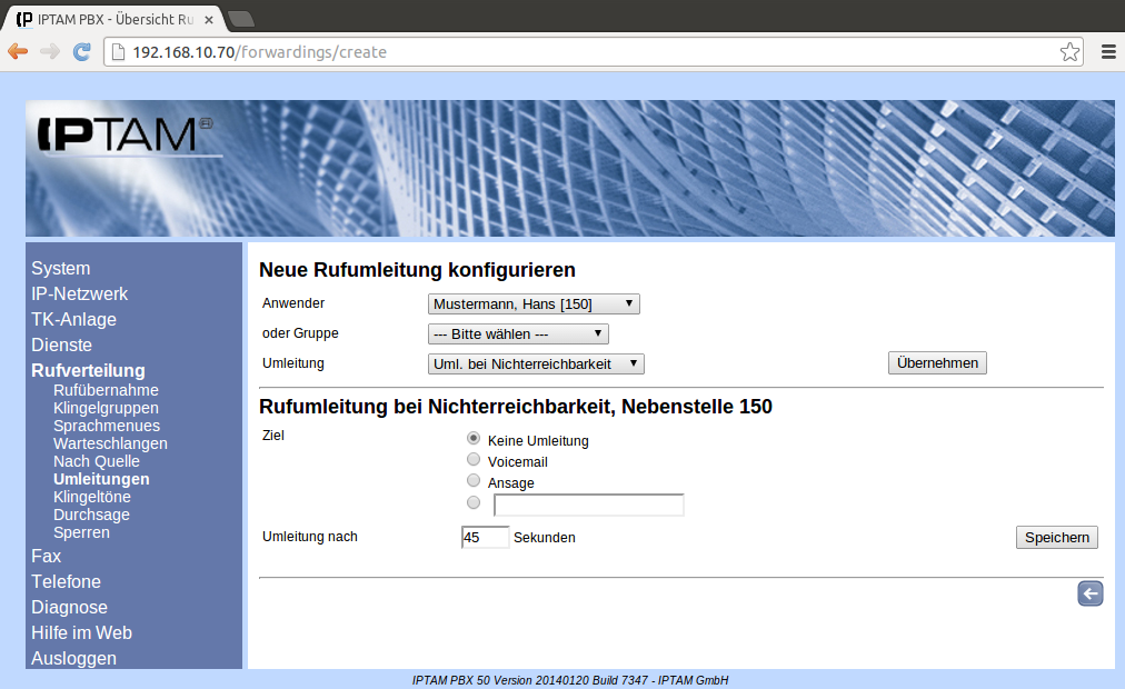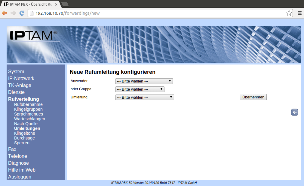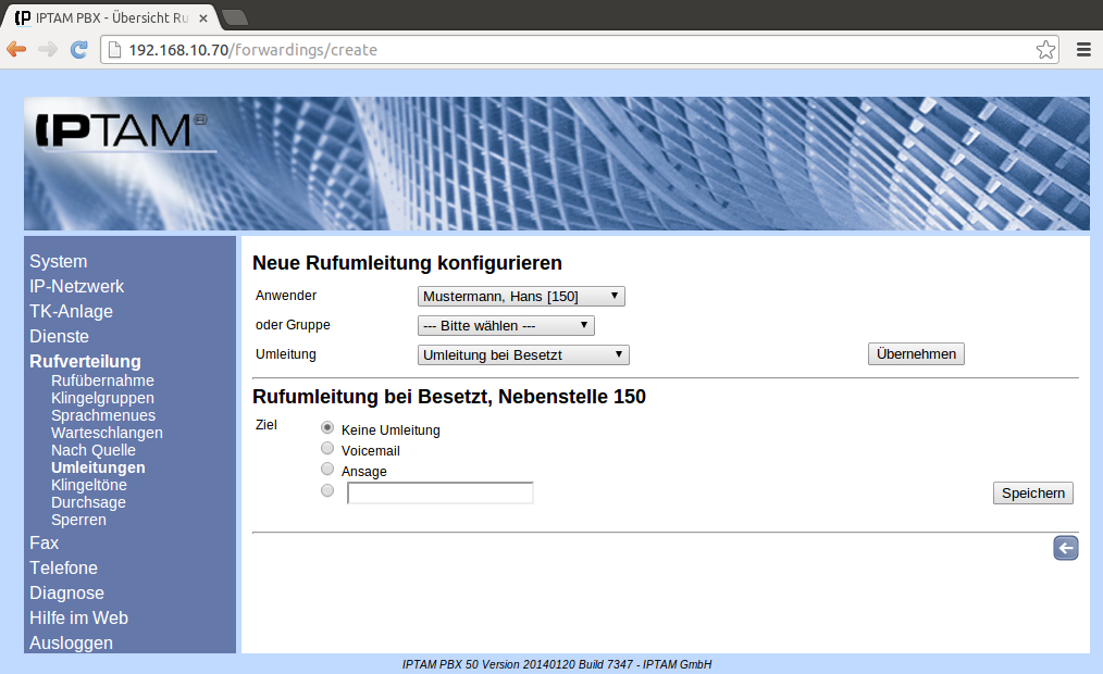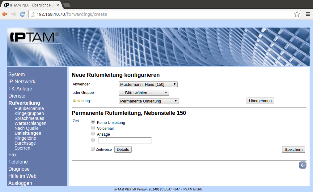 Die IPTAM® PBX verfügt über unterschiedliche Rufumleitungsszenarien. Die Umleitung leitet den Anrufer jeweils zu einer anderen Nebenstelle, einem externen Ziel, dem Anrufbeantworter des Anwenders oder zu einer Ansage. Es werden nur Anrufe umgeleitet, die direkt an einen Anwender gerichtet sind:- Permanente Umleitung