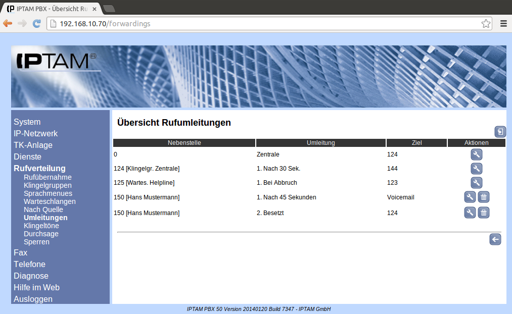 Jeder Anwender Ihrer IPTAM® PBX kann seine persönliche telefonische Erreichbarkeit durch unterschiedliche Umleitungen steuern (siehe dazu auch Abschnitt 3 „Rufumleitungen“ im Anwenderhandbuch). Darüber hinaus können Anrufe an Gruppen von Anrufern (Warteschlangen, Klingelgruppen) umgeleitet werden.Der Administrator kann im Menü Rufverteilung ► Umleitungen eine Übersicht aller aktiven Umleitungen in der Telefonanlage einsehen sowie diese ändern oder neu konfigurieren. Neben den Umleitungen der Anwender werden auch die Weiterleitungen aus Warteschlangen und Klingelgruppen hier aufgelistet, so dass der Administrator an einer Stelle alle Umleitungen im Blick hat..
