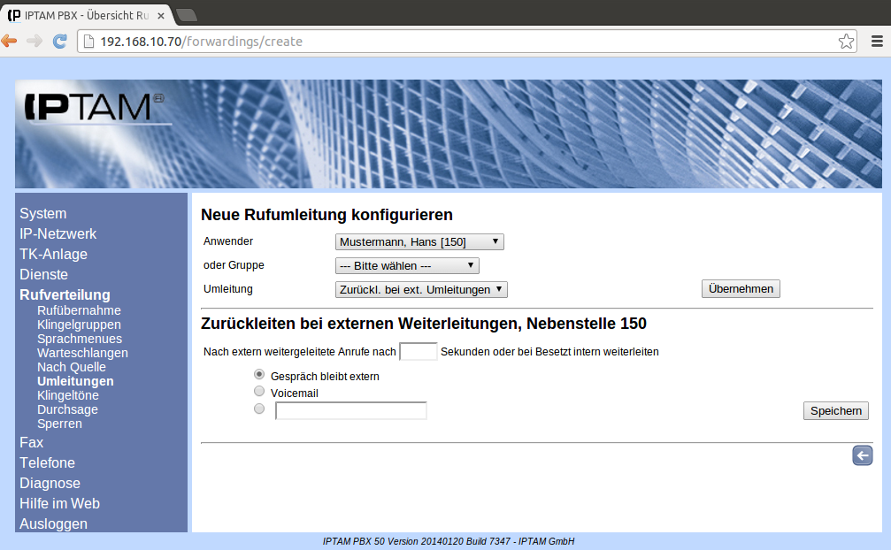 - Wenn bei einem Anwender Anrufe an ein externes Ziel umgeleitet werden (durch eine der anderen hier genannten Umleitungen) und das Gespräch am Ziel nicht angenommen wird, kann das Gespräch zur Voicemail oder zu einem neuen Ziel in der IPTAM PBX geleitet werden.