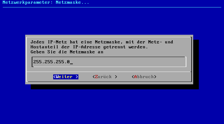 Die IP-Adresse, unter der die Anlage zukünftig zu erreichen sein soll, sowie die dazugehörige Netzmaske müssen eingegeben werden. Es muss eine feste Adresse vergeben werden. Der Bezug einer IP-Adresse per DHCP ist nicht vorgesehen. Sie können die IP-Adresse und die Netzmaske später über die Web-Oberfäche der IPTAM® PBX ändern (siehe „Konfiguration der IP-Interfaces“IP-Adresse des Default-Gateways
