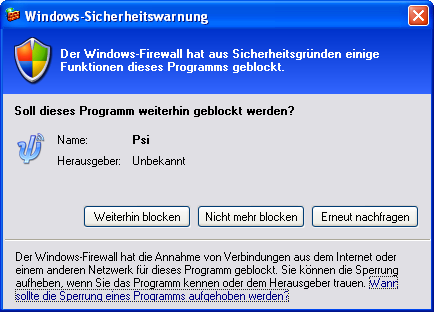 Beim ersten Start des XMPP-Clients erscheint je nach System ein Hinweis der Firewall. Klicken Sie in diesem Fall auf „Nicht mehr blocken“.