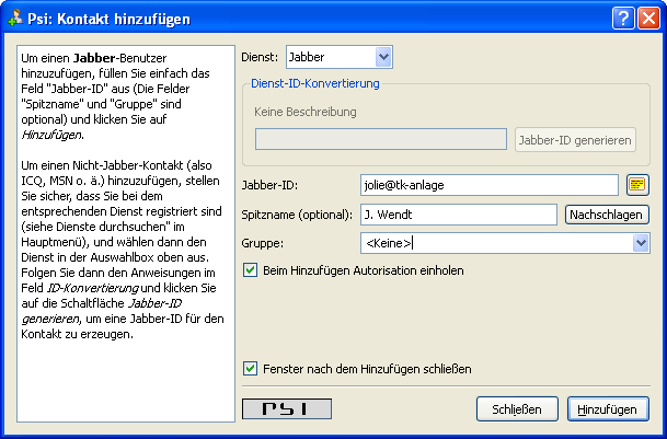 Sie können Kontakte hinzufügen, indem Sie mit einem Rechtsklick auf den Namen des Servers klicken und den Eintrag „Kontakt hinzufügen“ auswählen. Sie sehen dann den rechts dargestellten Dialog. Tragen Sie die JID des Anwenders bei „Jabber ID“ ein. Wenn Sie weitere Kontakte hinzufügen möchten, ohne jedes Mal den Dialog neu starten zu müssen, deaktivieren Sie die Checkbox „Fenster nach dem Hinzufügen schließen“.