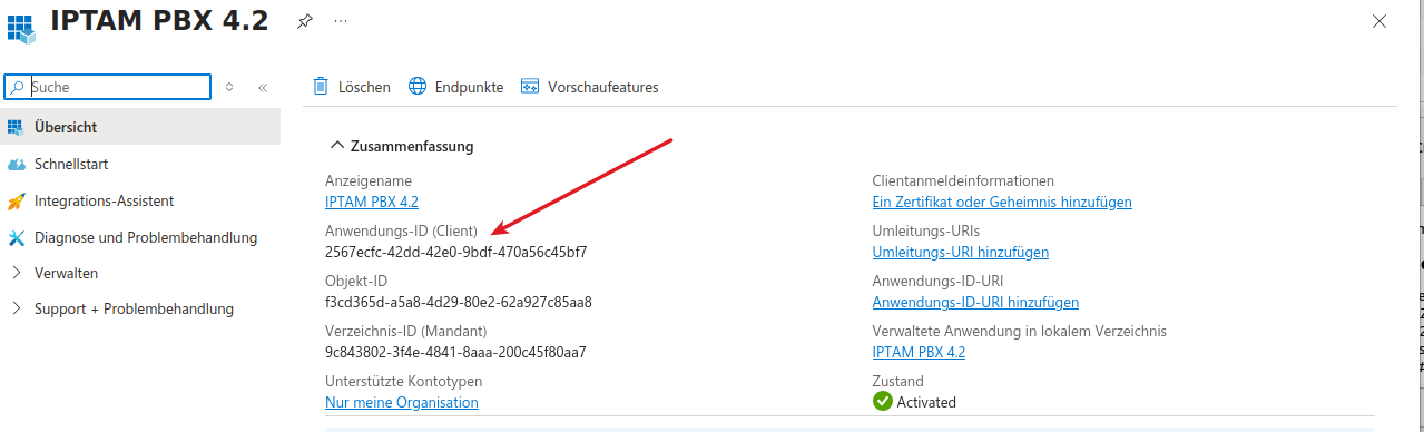 Sie gelangen zum links dargestellten Dialog. Die markierte „Anwendungs-ID“ kopieren Sie. Sie wird später in der IPTAM
