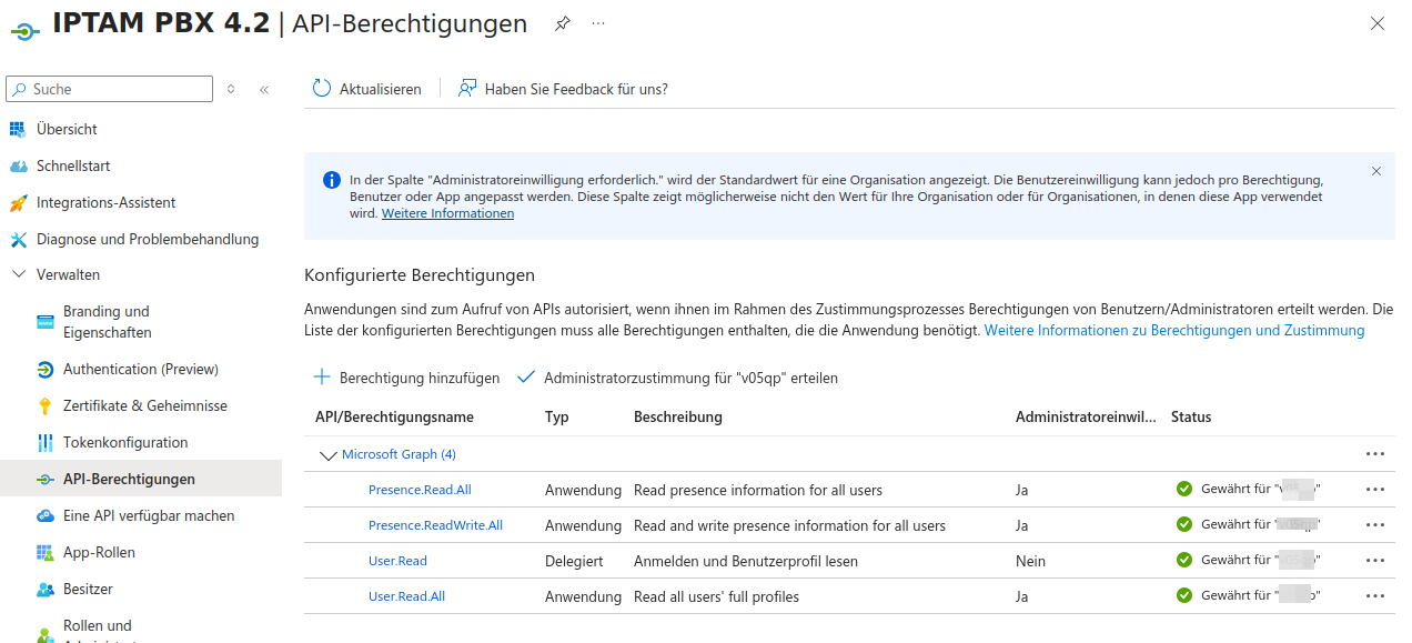 In der Übersicht der Berechtigungen zu Ihrer App klicken Sie zum Abschluss auf den Link „Administratorzustimmung für „xxx“ erteilen“ („xxx“ bezeichnet Ihre Domain bzw den Tennant). Anschließend sehen Sie die Übersicht der Berechtigungen wie in rechts dargestellt.