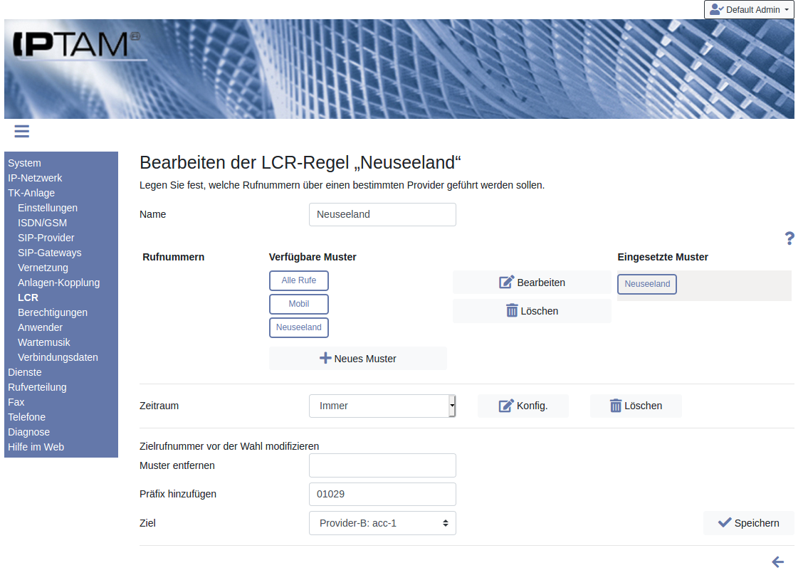 Sie können Regeln, die gleiche Rufnummernbereiche abdecken, mit unterschiedlichen Zielen vorsehen. Die Regeln werden dann in der vorgegebenen Reihenfolge verwendet. Wenn eine Regel scheitert, weil zum Beispiel der eingesetzte Provider den Anruf mit einer Fehlermeldung abweist, wird die nachfolgende Regel verwendet. Dieses Verhalten können Sie für eine simple Lastverteilung nutzen.